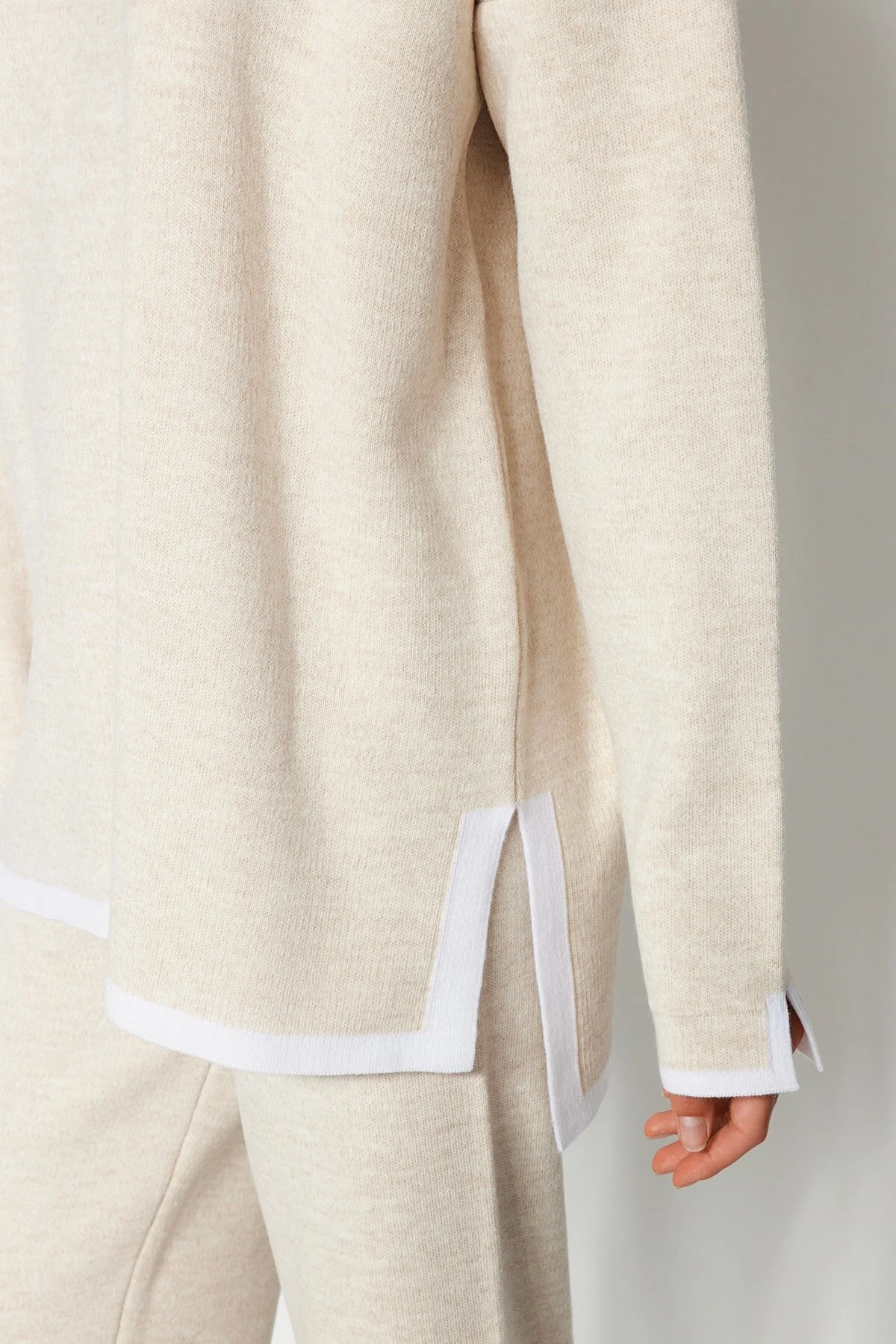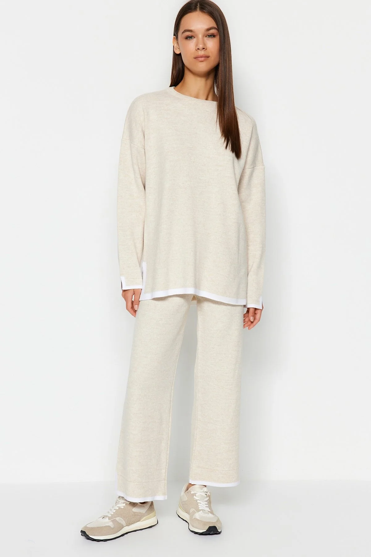 Bej Geniş Kalıp Kontrast Renkli Triko Alt-Üst Takım
