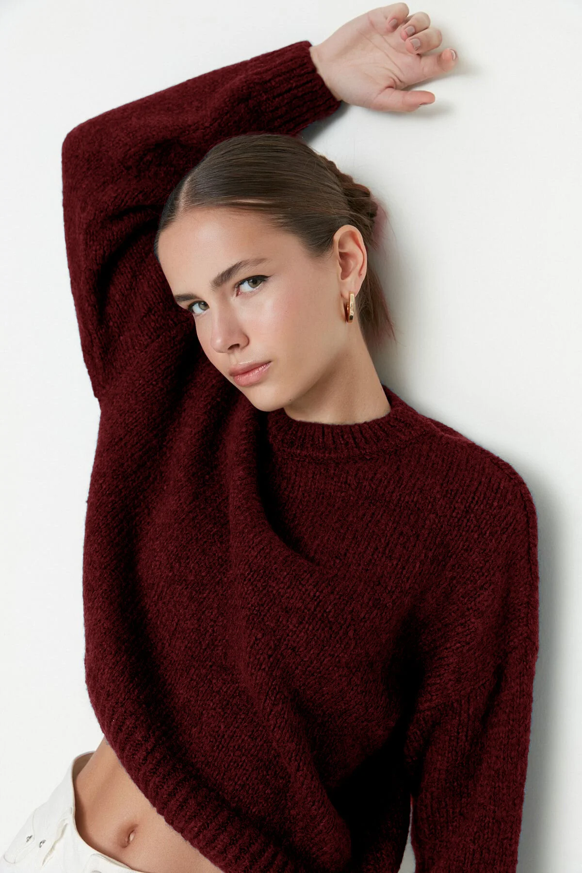 • Bordo Geniş Kalıp Yumuşak Dokulu Basic Triko Kazak