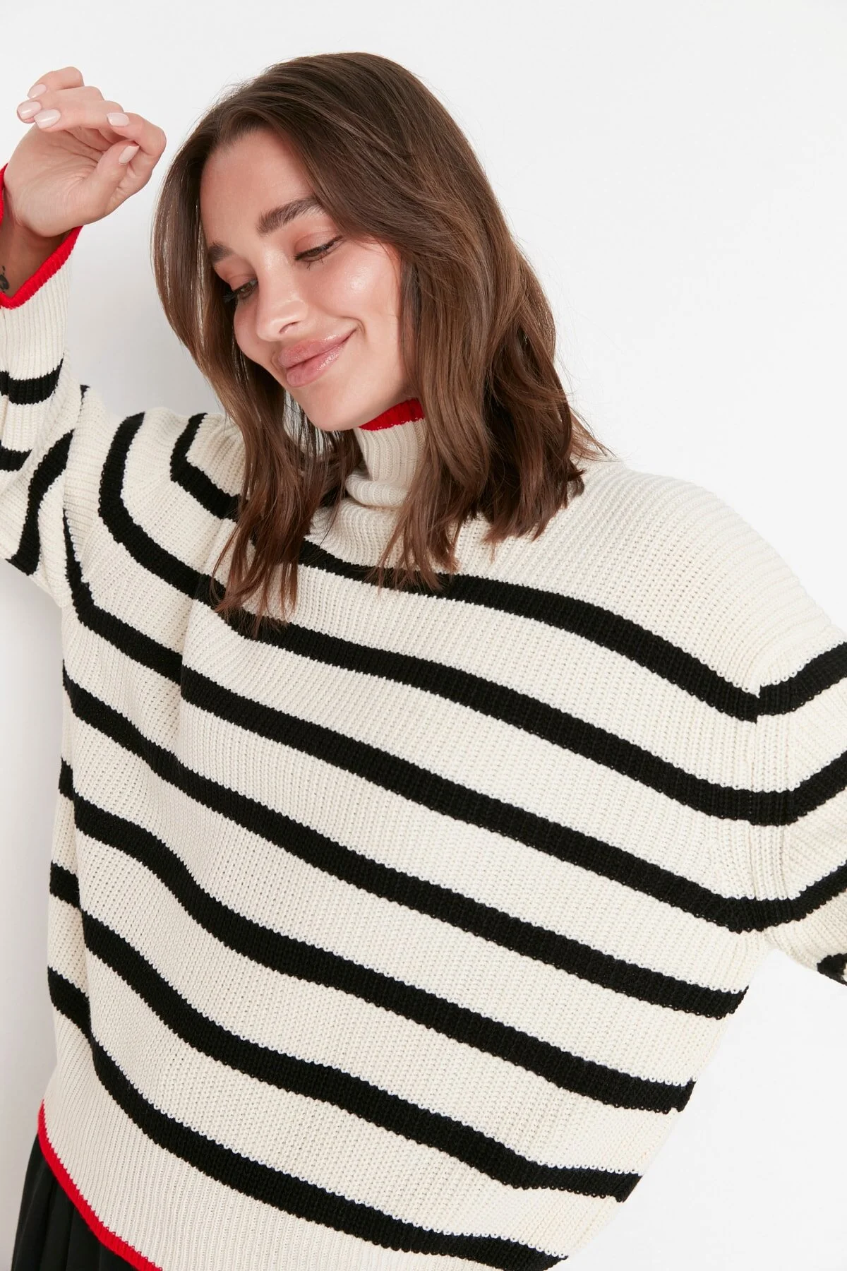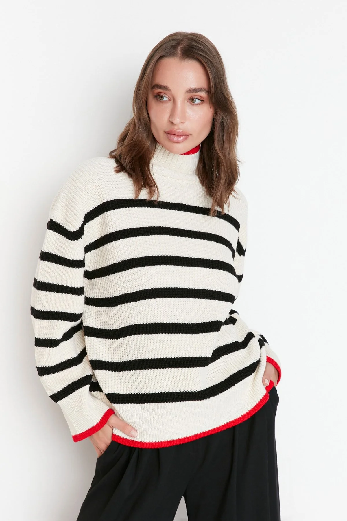 • Ekru Geniş Kalıp Çizgili Triko Kazak